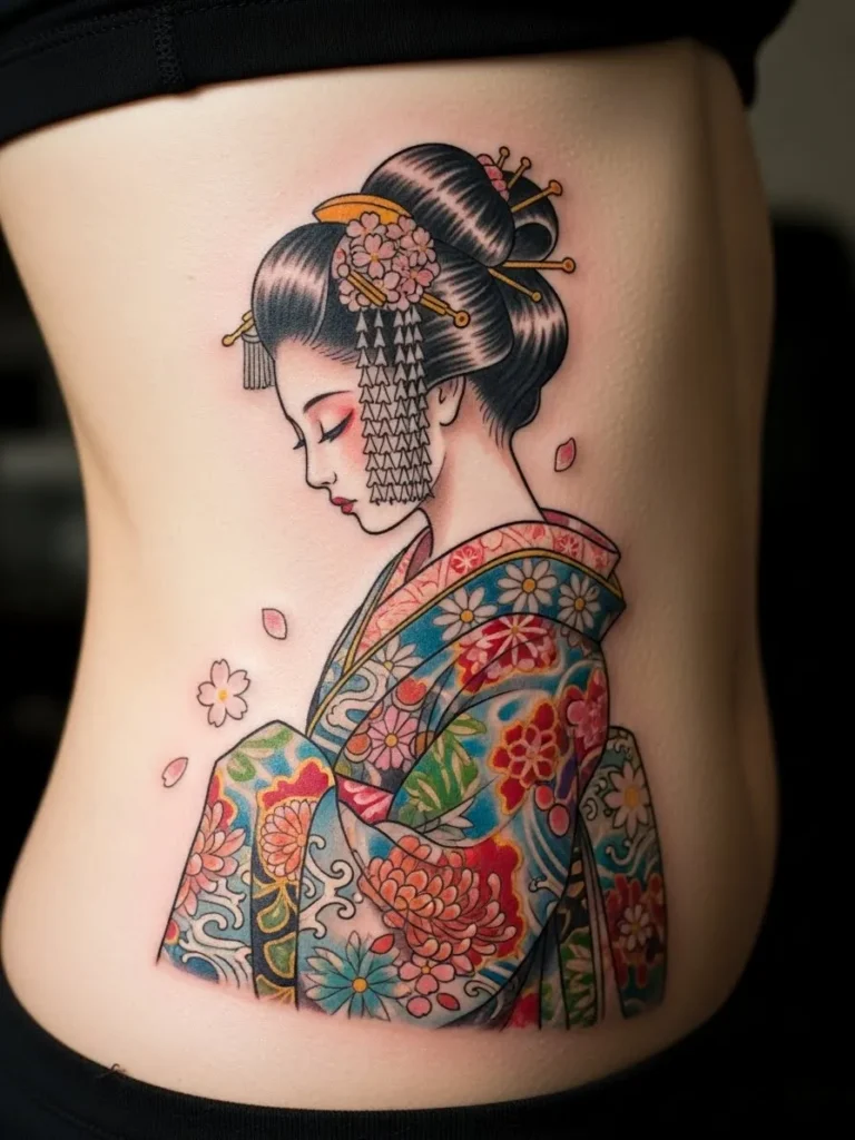 This tattoo, located on the side of the body, features a geisha in a colorful kimono with delicate floral and geometric designs. The vibrant mix of colors, such as blues, reds, and yellows, makes this tattoo visually striking and bright. The geisha’s graceful posture and serene expression complement the dynamic flow of the kimono, creating a balanced and fluid design. The side placement emphasizes the movement in the design, allowing the tattoo to curve naturally along the body.