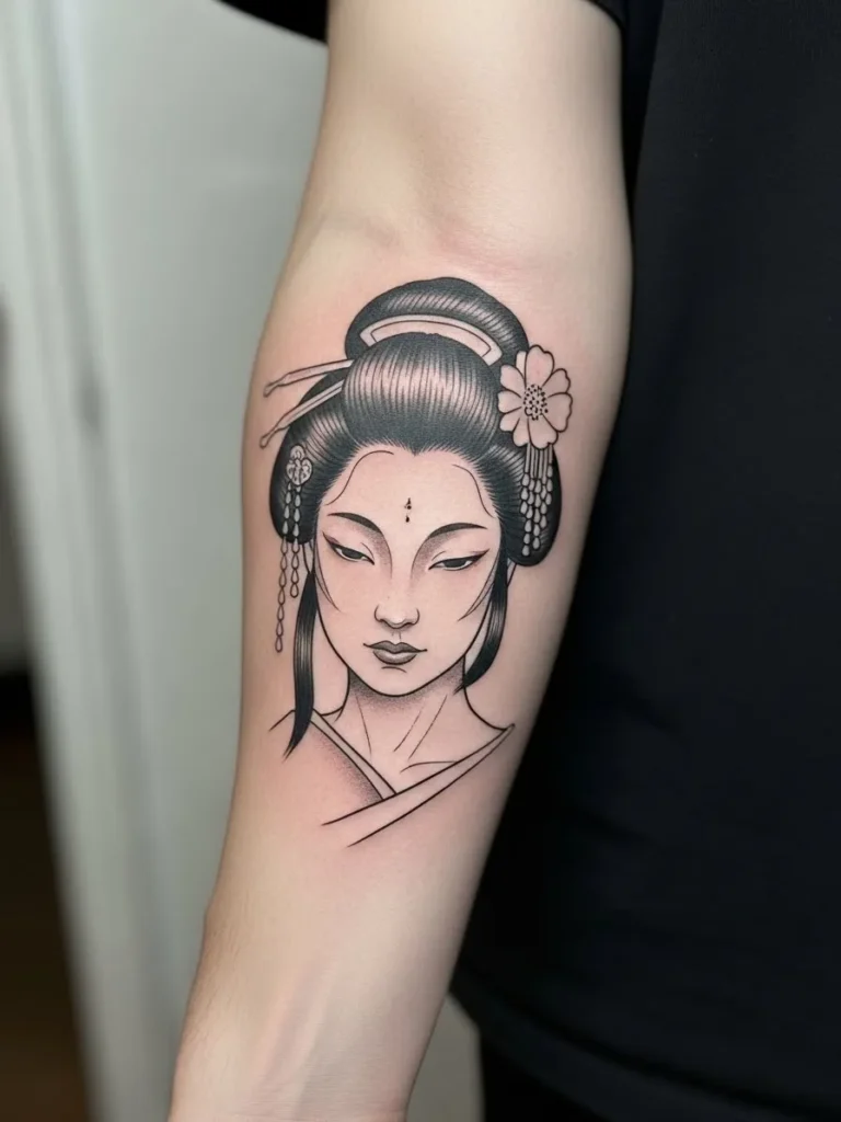 Here, we see a small and elegant tattoo of a geisha’s face, done in minimalist black ink. This design is perfect for those who prefer delicate, understated tattoos. The geisha’s face is framed by a simple hairstyle with a hairpin, adding to the subtle beauty of the design. The placement on the inner wrist adds to its intimate nature, making this tattoo a quiet yet meaningful expression of traditional Japanese art in a minimalist form.