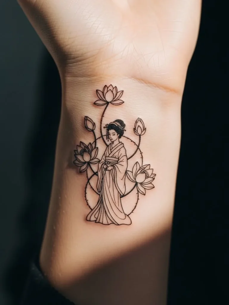 This minimalist tattoo on the inner wrist features a small geisha surrounded by delicate lotus flowers. The design is done entirely in black ink, with clean lines and simple details, making it a subtle yet elegant piece. The geisha’s serene expression and the soft curvature of the lotus petals add a touch of tranquility to the tattoo. The wrist placement enhances its personal and intimate nature.