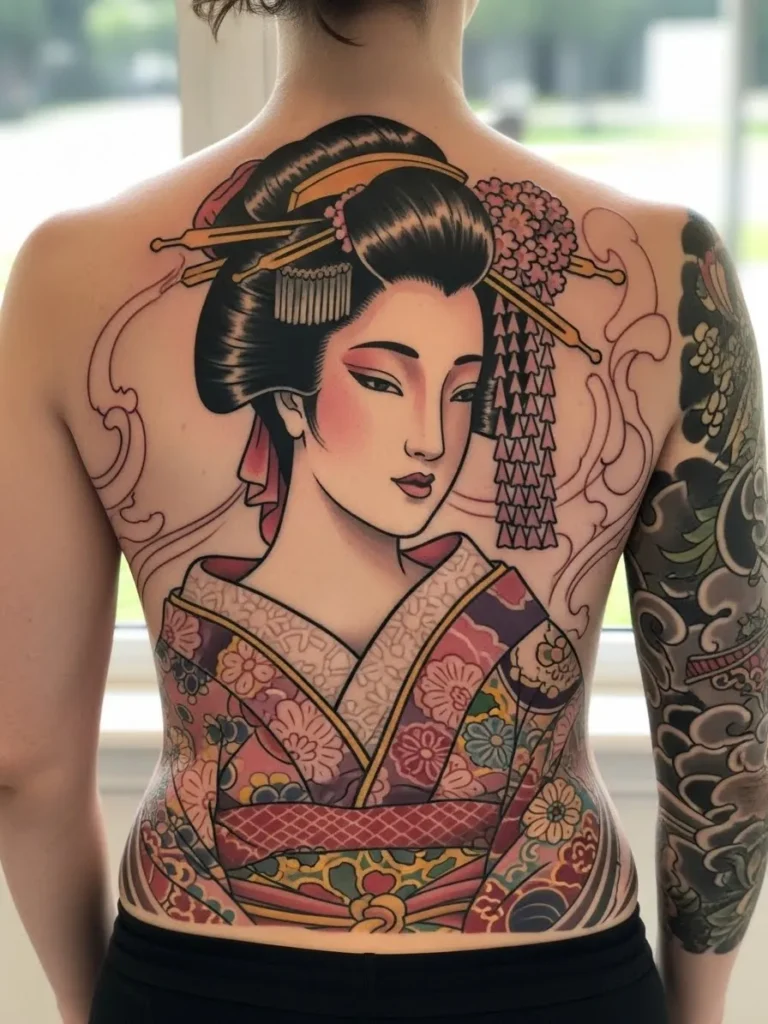 This stunning full-back tattoo features a geisha in a traditional kimono surrounded by vibrant flowers and swirling patterns. The design is rich in color, with deep reds, blues, and greens creating a striking contrast. The geisha’s serene expression and intricate kimono are highlighted by bold outlines, while the surrounding flowers and patterns add depth and movement to the piece. The back placement allows the tattoo to flow naturally along the body, creating a truly breathtaking piece of art.