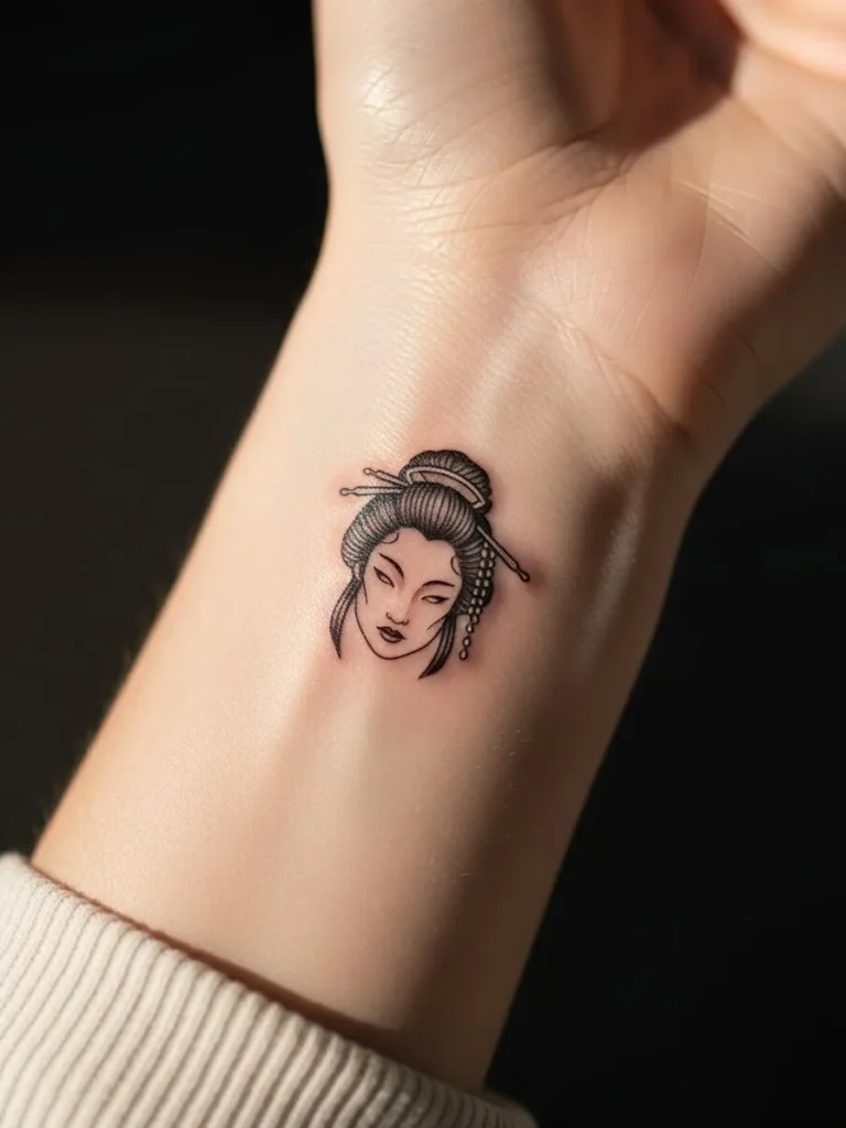 What I love about this tattoo is its simplicity and elegance. The clean lines and minimalistic style really highlight the beauty of the geisha’s face, and the placement on the wrist makes it feel so personal. It’s a subtle nod to Japanese culture, but with a modern, minimalist twist. I can’t help but feel that it would be a perfect tattoo for someone who wants a piece that’s meaningful yet discreet.