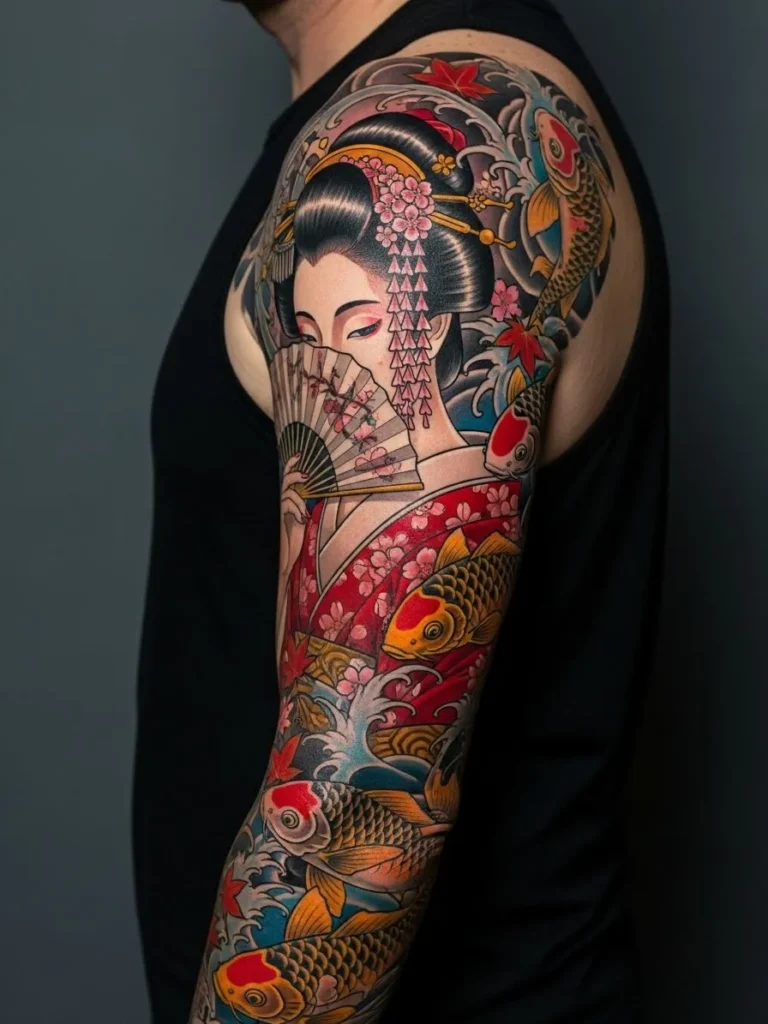 What strikes me most about this tattoo is the way it tells a story through its intricate details and the dynamic flow of the koi fish and waves. It’s bold, vibrant, and filled with symbolism. The geisha adds a layer of mystery, and the fan brings an element of refinement. This sleeve would undoubtedly make a powerful statement while showcasing a blend of tradition and modern style.