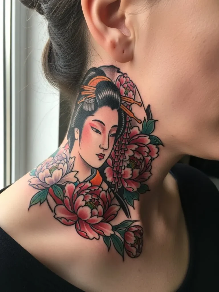 This stunning tattoo stretches across the neck and features a geisha’s portrait surrounded by blooming peonies. The geisha’s face is serene, with her hair intricately styled and adorned with traditional ornaments. The peonies, often symbolizing wealth, good fortune, and beauty, contrast beautifully with the dark ink of the geisha. The colors in this design, from the soft pink peonies to the rich black shading, are perfectly balanced, creating a dramatic yet elegant effect on the neck.