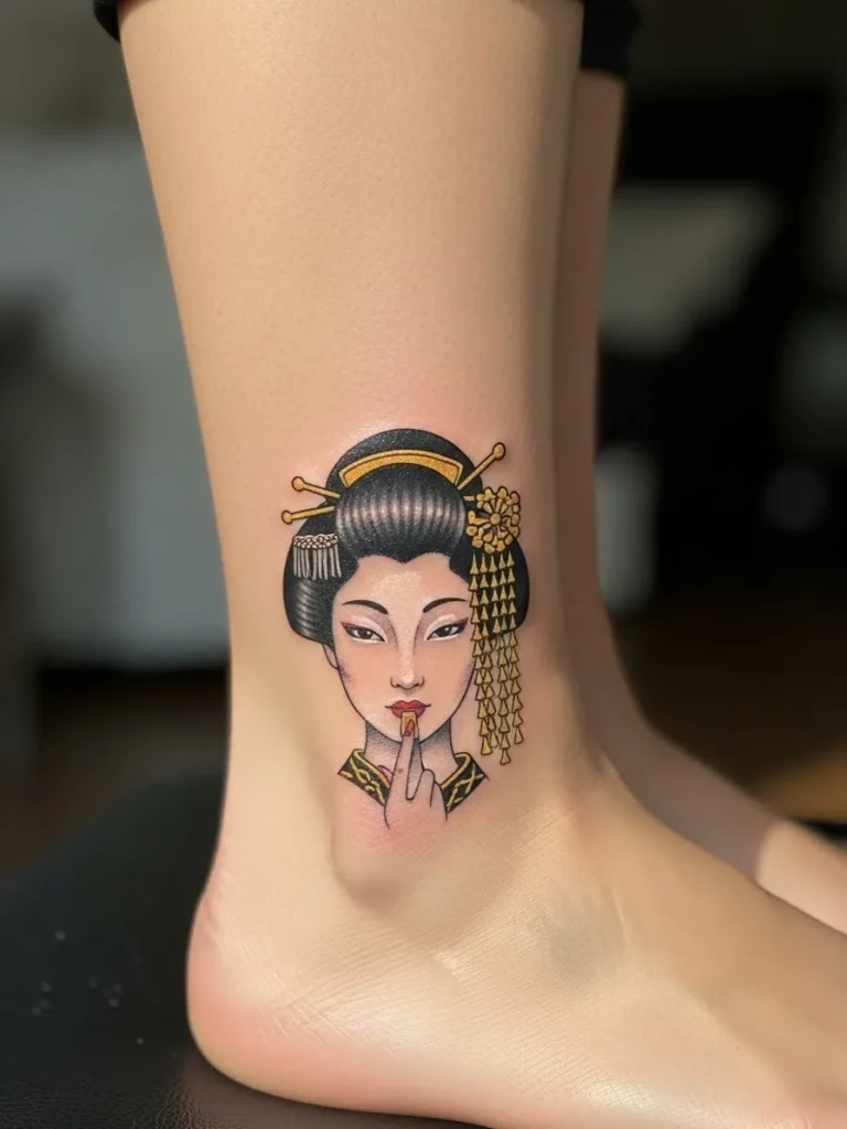 This smaller tattoo, placed on the ankle, showcases a geisha with a gentle shushing gesture, a unique and striking pose for a tattoo. Her classic hairstyle and delicate features are accentuated by the minimalistic color palette of black, gold, and soft shading. The design is clean and simple, with a focus on the geisha’s face and the subtle gesture of her finger on her lips. The ankle placement adds an intimate and subtle touch to the design, making it perfect for those who prefer small yet meaningful tattoos.