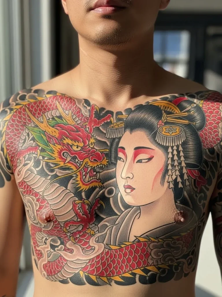 I am completely in awe of how this tattoo combines the calmness of the geisha with the fierce energy of the dragon. The vibrant colors and intricate details make the design come alive, and the chest placement adds such a bold, dramatic effect. It’s a tattoo that tells a story, blending two powerful symbols—beauty and strength—in a way that’s both artistic and captivating.