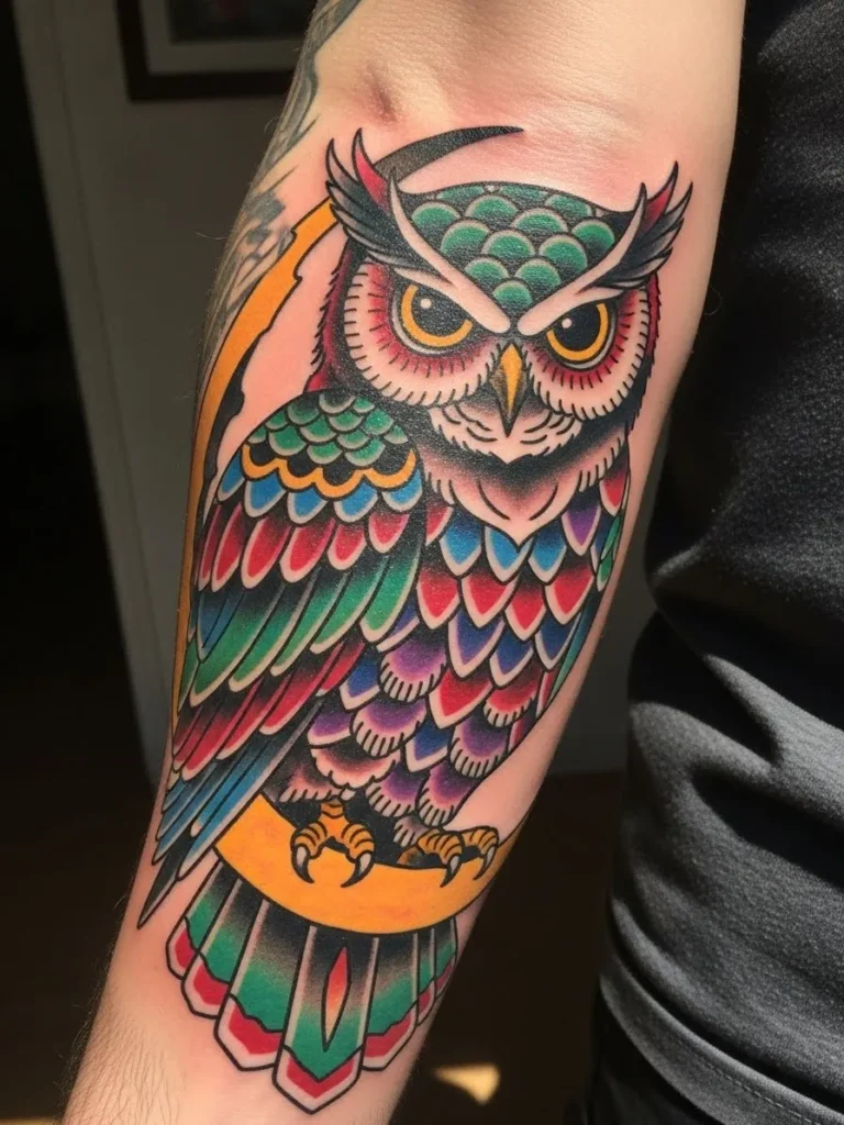 I love how this tattoo feels like a little guardian that follows you everywhere. The colors feel joyful yet powerful and the owl’s expression has that perfect mix of mystery and sass. It is the kind of tattoo that sparks compliments from total strangers and honestly I would enjoy every one of them.
