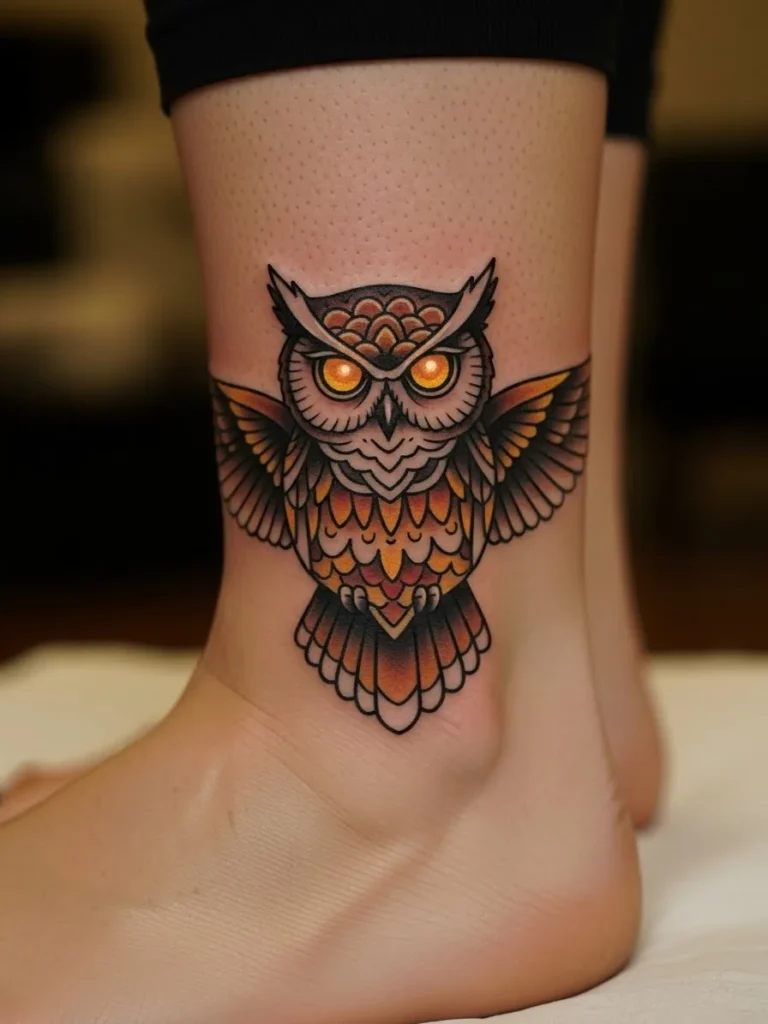 This neo traditional owl tattoo sits neatly on the front of the ankle and features warm amber tones that glow across every feather. The wings spread outward just enough to frame the design and the eyes shine with a soft golden light. Clean linework shapes the entire silhouette and the size keeps the tattoo delicate without losing detail.
