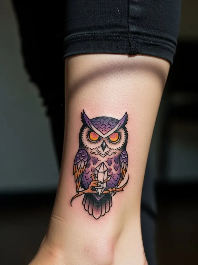I love how whimsical this design feels. The crystal makes the owl look like a tiny keeper of secrets and the purple palette gives it such a dreamy vibe. It is the kind of tattoo that feels both cute and mysterious which is honestly my favorite combination.
