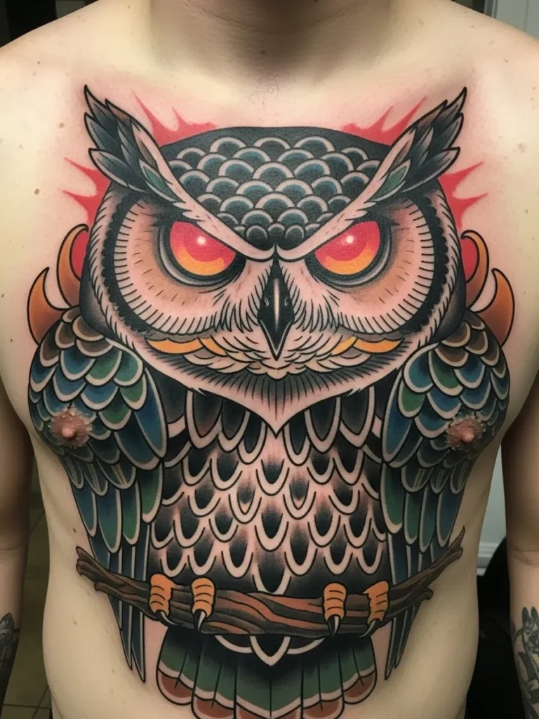 This neo traditional owl tattoo fills the entire chest with a bold symmetrical design. Deep greens blues and warm beige tones shape the feathers while the glowing red eyes create an instant focal point. The wings frame the chest muscles and the branch beneath the owl ties the whole composition together. Heavy outlines give it a strong traditional look and the size makes it a dramatic statement piece.