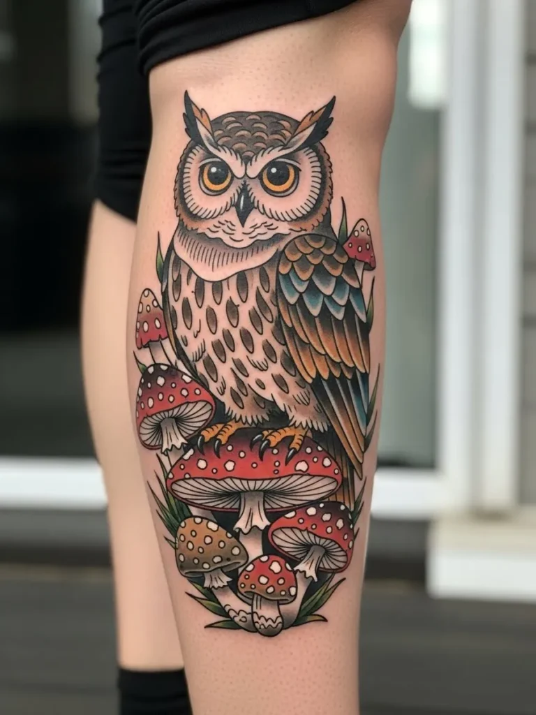 This neo traditional owl tattoo sits beautifully along the side of the thigh with the owl perched on a cluster of bright red and brown mushrooms. The earthy color palette blends warm browns greens and soft creams through the feathers while the mushrooms pop with bold white spots and deep red caps. The clean outlines give the tattoo a charming storybook feel and the size makes it a lovely statement piece without overwhelming the leg.