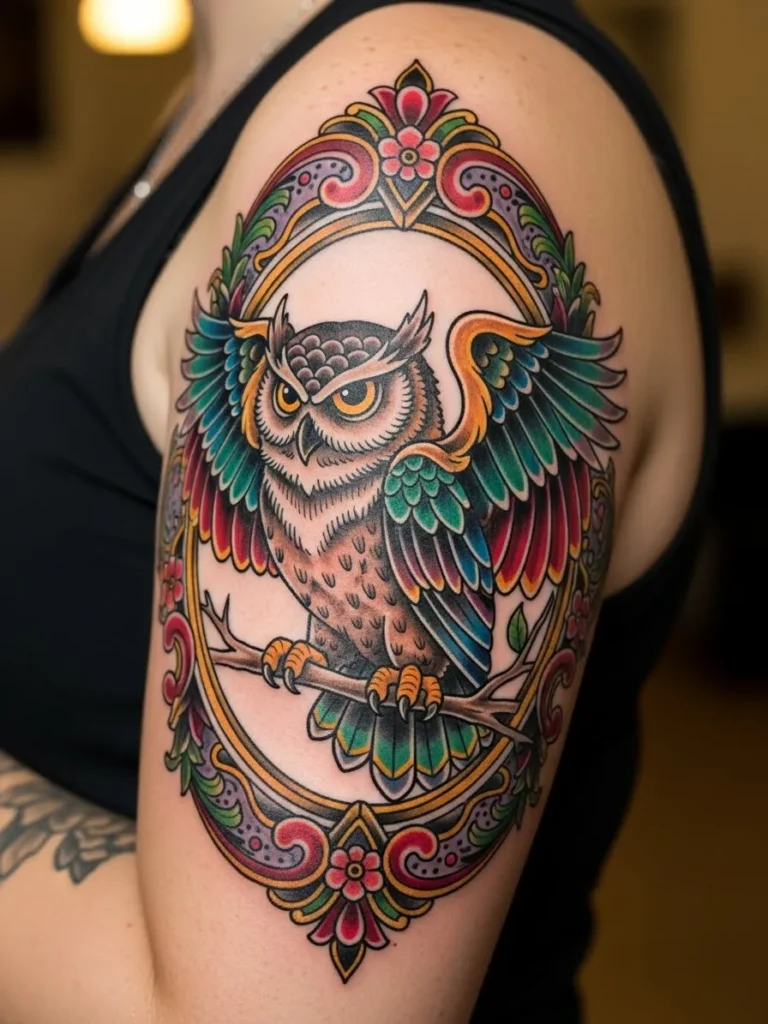 This neo traditional owl tattoo features a beautifully detailed owl perched inside an ornate frame that wraps around the upper arm. Vibrant shades of teal red gold and purple fill the wings and decorative border while bold black outlines keep everything crisp. The symmetry of the frame makes the owl feel like a centerpiece in an antique illustration and the placement works perfectly for showcasing all the small details.
