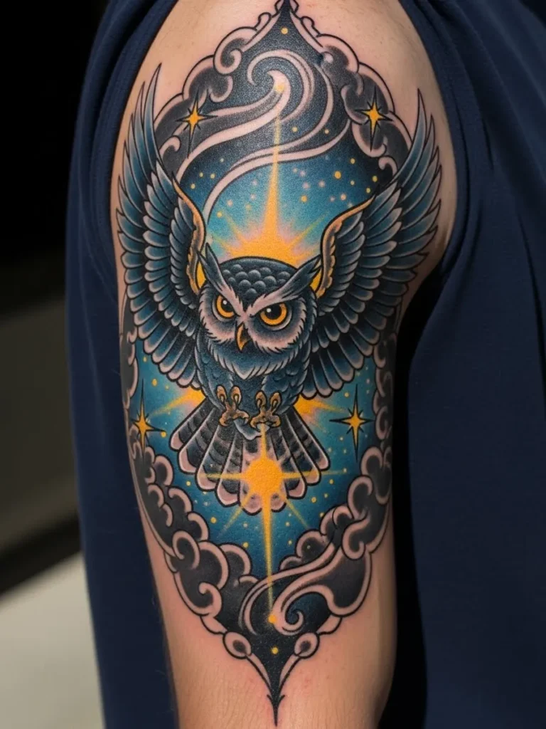 This neo traditional owl tattoo covers the upper arm with a magical night sky scene. Deep blues and blacks form swirling clouds while golden stars glow around the owl. A radiant beam of warm yellow light shines from behind giving the design a mystical aura. The owl spreads its wings in a dramatic pose and the bold outlines add strong contrast against the cosmic background.