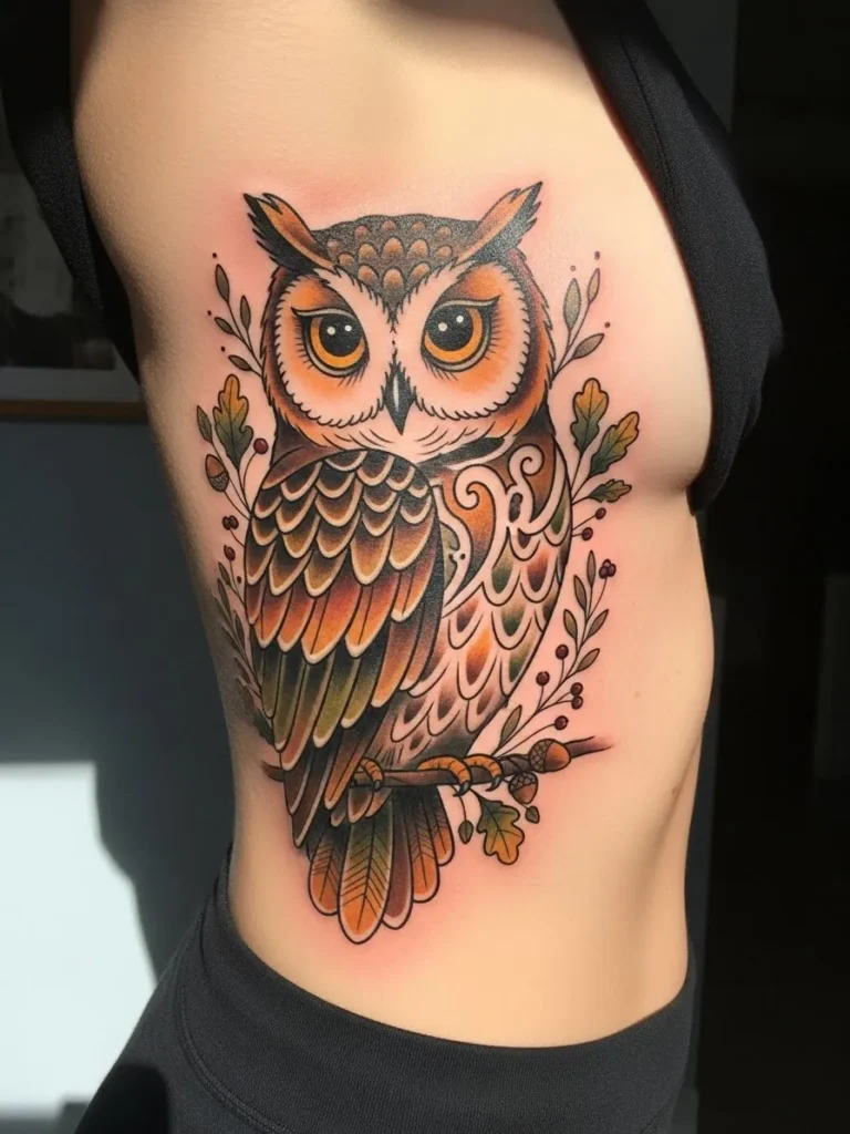 This neo traditional owl tattoo rests along the ribcage with warm oranges browns and muted greens flowing through its feathers. Leaves and tiny branches surround the owl adding a soft autumnal theme. The shading is smooth and the clean outlines keep the details sharp even on curved skin. The placement makes the design feel intimate and the size gives the owl plenty of room to show off its lovely textures.