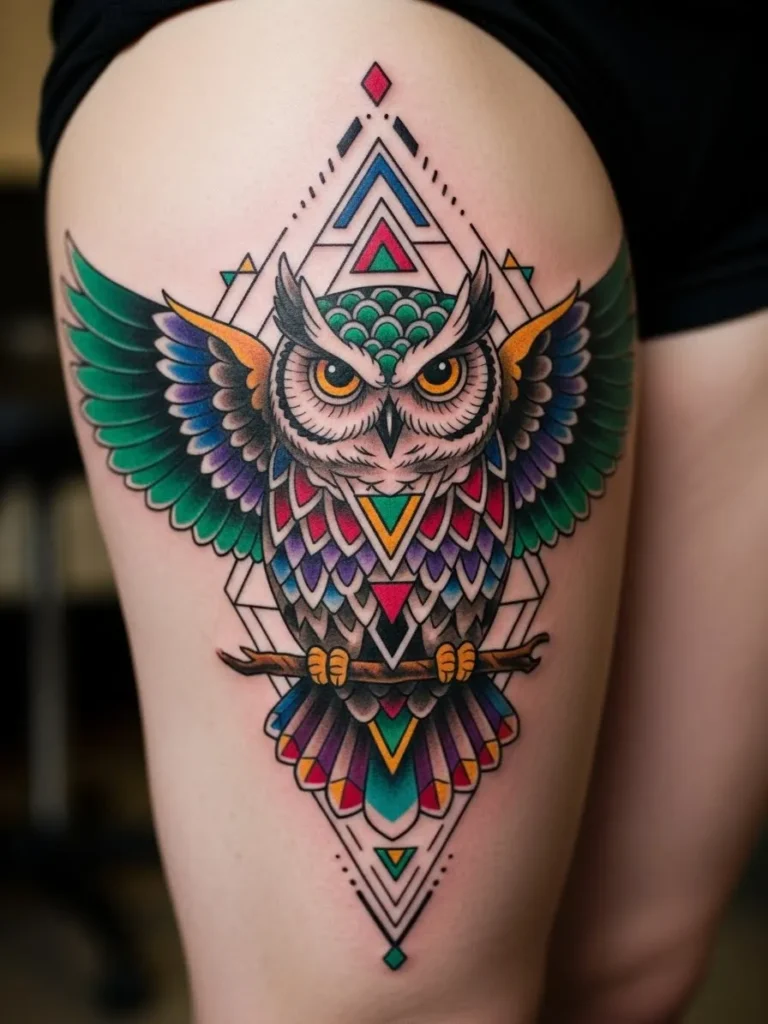 This neo traditional owl tattoo sits on the front of the thigh with a bold geometric frame made of triangles diamonds and layered shapes. The feathers shine with teal purple magenta and gold tones while the wings open in a striking symmetrical pose. Strong black outlines keep the design structured and the geometric elements add a fun modern twist to the classic owl shape.