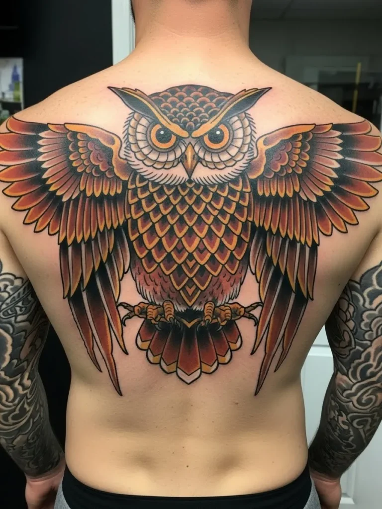 This neo traditional owl tattoo stretches across the entire upper back with wide wings that frame the shoulders. Warm shades of burnt orange bronze and deep red fill the feathers and the owl’s eyes glow with a soft amber tone. The heavy outlines and scalloped feather pattern give the tattoo a bold graphic look. The large size turns it into a commanding centerpiece that looks stunning from every angle.