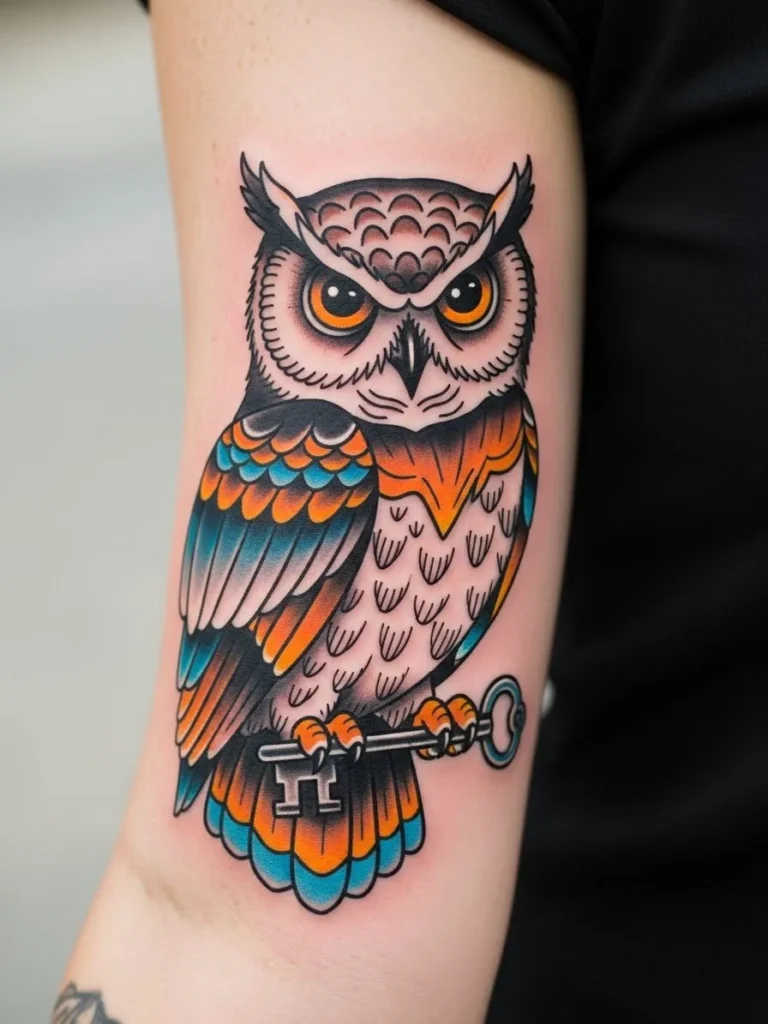 I love the storytelling vibe in this design. The key feels like a little hint that the owl knows something important and I am always a fan of tattoos that carry a hidden meaning. The colors glow beautifully and the whole piece has such a charming confident personality.