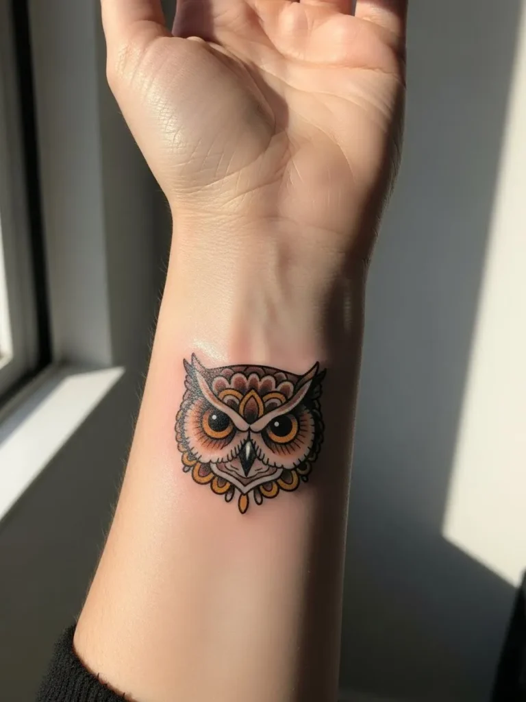 This small neo traditional owl tattoo sits on the inner wrist where it catches the light in the sweetest way. The warm palette of gold and soft brown gives the owl a gentle glow while bold black lines add structure. Even though it is tiny the design still shows lovely detail in the feathers and the expressive eyes create such a captivating look. The placement makes it easy to show or hide depending on your mood.