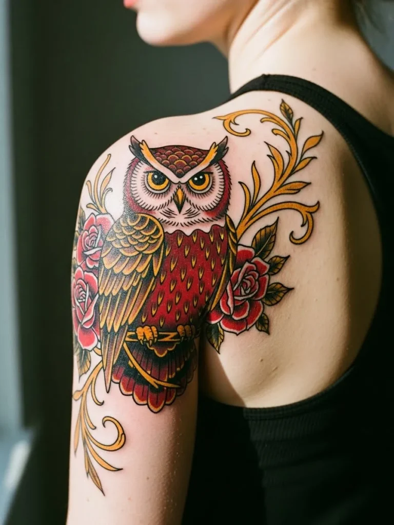 This neo traditional owl tattoo covers the upper shoulder with a stunning palette of deep red gold and black. The owl sits proudly among blooming red roses with swirling gold flourishes framing the entire piece. The bold outline work gives it a strong presence and the placement makes it look elegant and dramatic all at once.