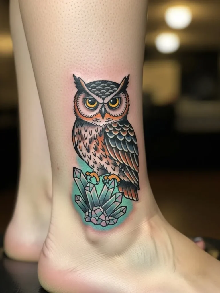This neo traditional owl tattoo sits around the ankle and shows the owl perched on a cluster of shimmering blue crystals. Warm browns and soft oranges color the feathers while the crystals glow with cool teal and white highlights. The clean outlines and tight details make the small size work beautifully and the ankle placement gives it a sweet delicate look.