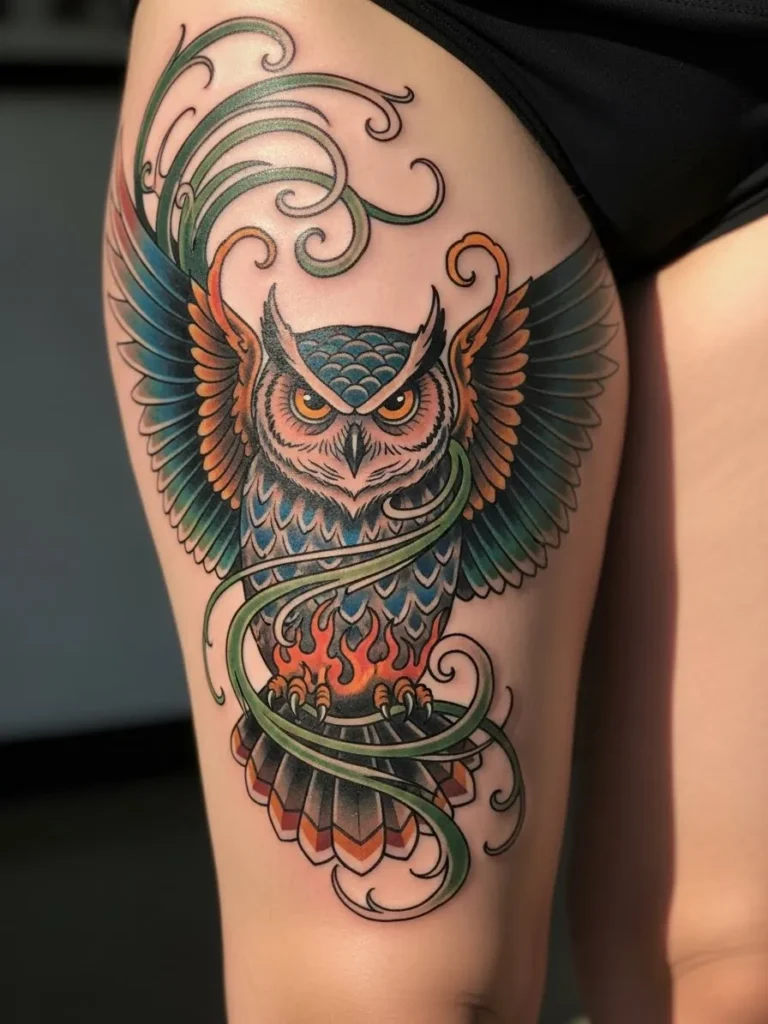 This neo traditional owl tattoo spreads across the thigh with bright orange flames and swirling green ribbons twisting around the owl. The wings open wide with blues and greens blending smoothly into warm earth tones. The bold lines and dynamic shapes make the entire piece look full of motion and the large size gives the owl a dramatic presence.