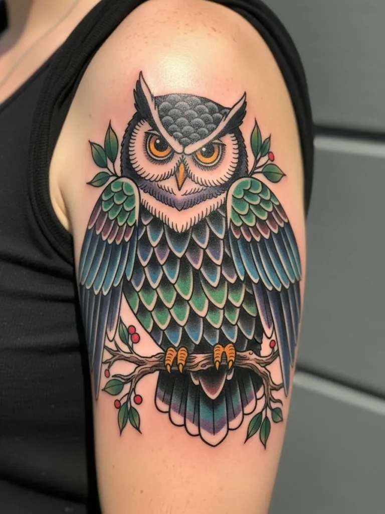This neo traditional owl tattoo sits on the upper arm and features lush green wings accented with hints of purple and navy. The owl is perched on a branch dotted with tiny red berries and the feathers are arranged in beautiful layered patterns. The bold outlines highlight every curve and the placement makes it easy to show off.
