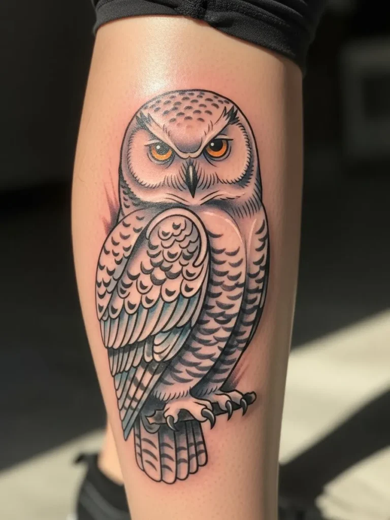 This neo traditional owl tattoo is placed on the outer calf where its snowy color palette really stands out. Soft shades of pink blush through the feathers while cool grey creates depth in each layered shape. The orange eyes give the whole piece a striking contrast. Clean linework frames the design in that timeless neo traditional look and the size is just right for a statement without taking over the entire leg.