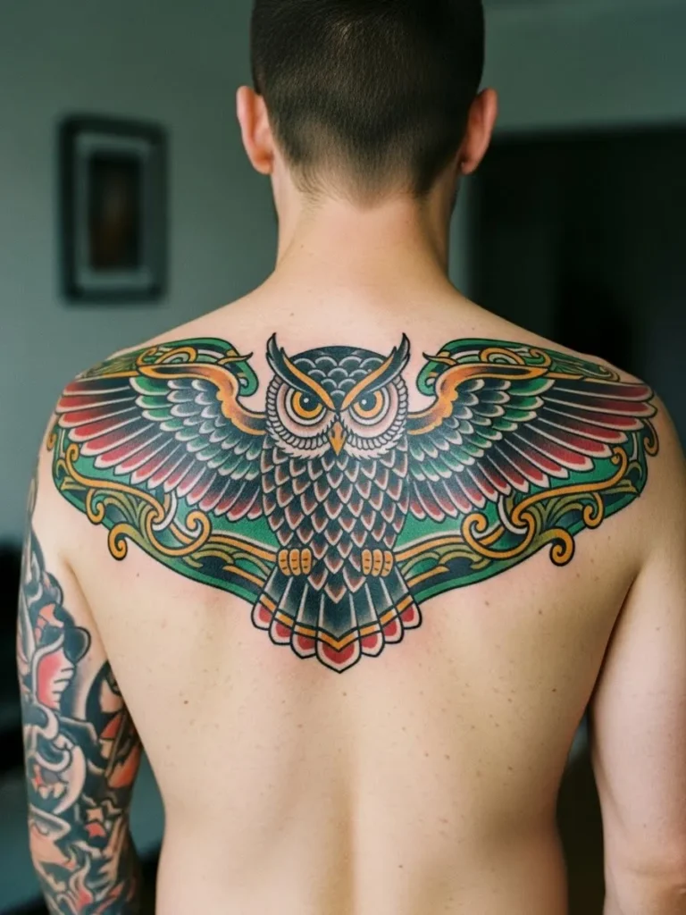 This breathtaking neo traditional owl tattoo stretches across the upper back and showcases a stunning wing span. Deep greens reds and golds blend through the feathers in bold symmetrical patterns. Thick black outlines give the entire piece a dramatic presence while the curling decorative elements around the wings add an ornate touch. The size makes it a true centerpiece and the placement lets every detail shine.