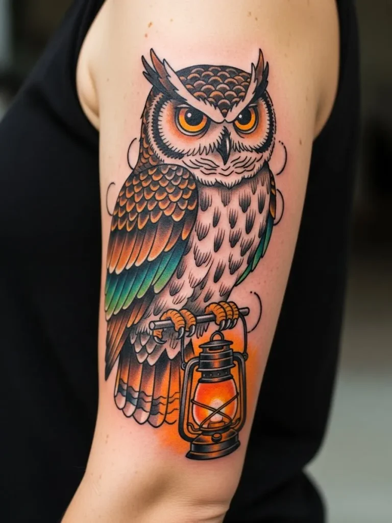 I adore tattoos with tiny storytelling elements and this lantern absolutely steals my heart. It makes the owl feel wise and a little magical like it is lighting the way through your personal adventures. The colors are rich without being loud and the whole vibe feels comforting and mysterious at the same time.