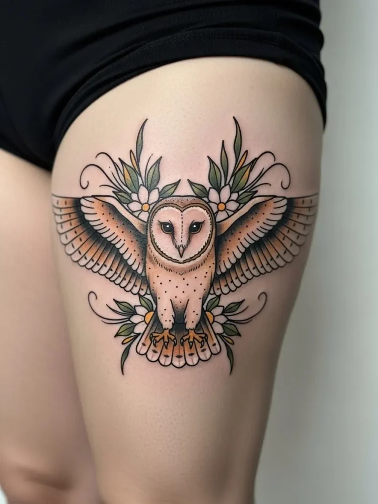 This neo traditional barn owl tattoo spreads elegantly across the upper thigh with wings open wide. Soft peach and tan shades fill the owl’s body while thin black outlines keep everything crisp. Delicate flowers and leaves wrap around the wings adding a gentle botanical touch. The size works beautifully on the thigh giving the design plenty of room to show off the feather details and flowing shapes.