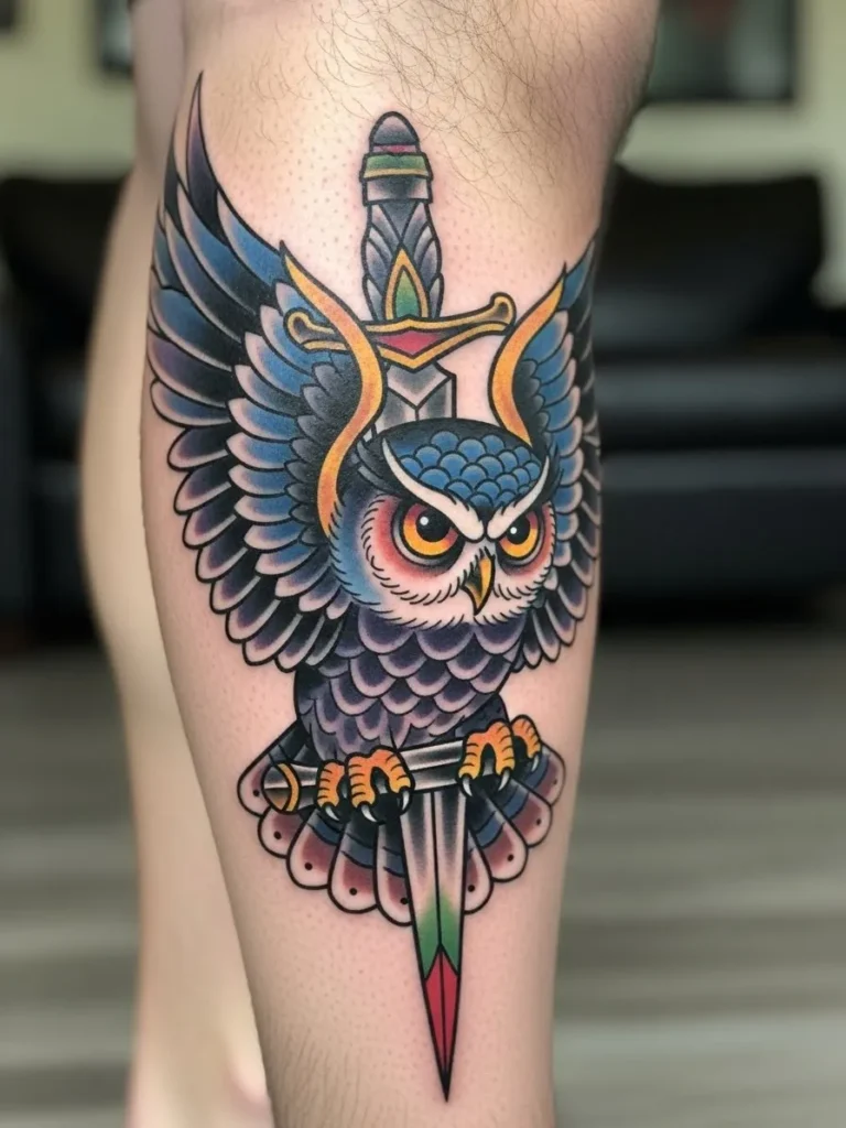 This neo traditional owl tattoo sits on the calf and pairs a fierce little owl with a decorative sword that runs straight through the center of the design. The wings stretch upward in bold blue and gold tones while the layered feathers on the body move from deep purples to soft greys. Thick outlines and smooth shading give the whole piece that classic iconic look. The size fits the calf perfectly and the sword adds a dramatic vertical shape that draws the eye.