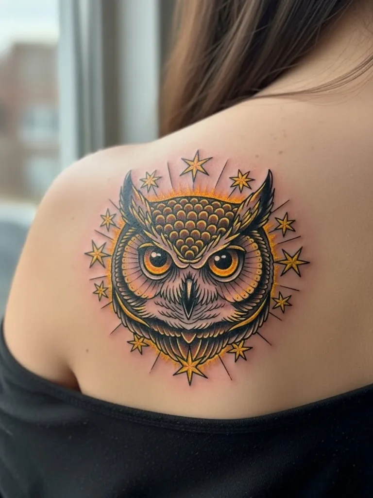 This neo traditional owl tattoo rests beautifully on the upper shoulder blade with a circle of golden stars framing its head. Warm oranges and rich golds glow across the feathers while soft pink shading around the edges gives the tattoo a luminous effect. The bold black outlines keep everything crisp and the placement makes the owl look like it is floating gently over the shoulder.
