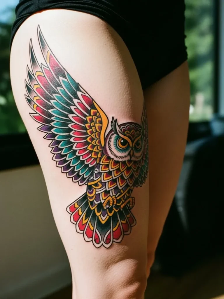 This neo traditional owl tattoo spreads across the outer thigh with huge colorful wings that stretch toward the hip. Reds greens purples and golds blend together in a gorgeous layered pattern that shows off the feather details. The bold outline work brings out the traditional style while the smooth gradients make it feel soft and modern. The placement gives the wings plenty of room to open up which creates such a dynamic look.
