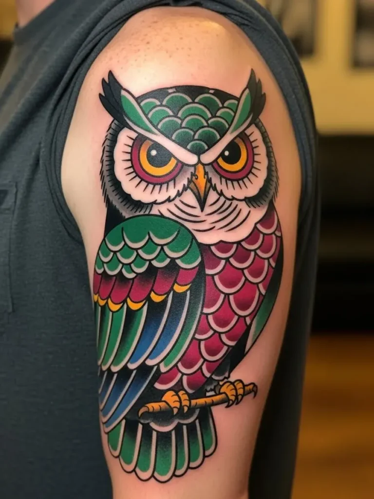 This neo traditional owl tattoo sits proudly on the upper arm with bold outlines and rich gemstone shades of green magenta and gold. The size is large enough to wrap the shoulder nicely without feeling overwhelming. The feathers are layered with classic thick lines while the eyes glow with warm yellows that make the whole piece feel alive. The colors are saturated and clean which gives the owl a strong modern twist while still keeping that classic flash influence.