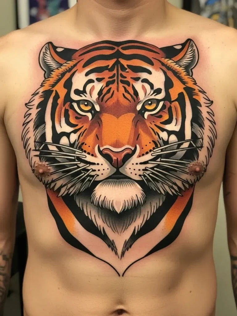 This neo traditional tiger tattoo stretches across the chest with bright orange tones deep blacks and bold symmetrical lines. The face is centered perfectly so the eyes line up naturally with the chest and the fur shading gives it a soft gradient effect. The size is large and dramatic but the clean outlines keep it balanced. The warm colors and crisp whiskers make the tiger look fierce and refined at the same time.