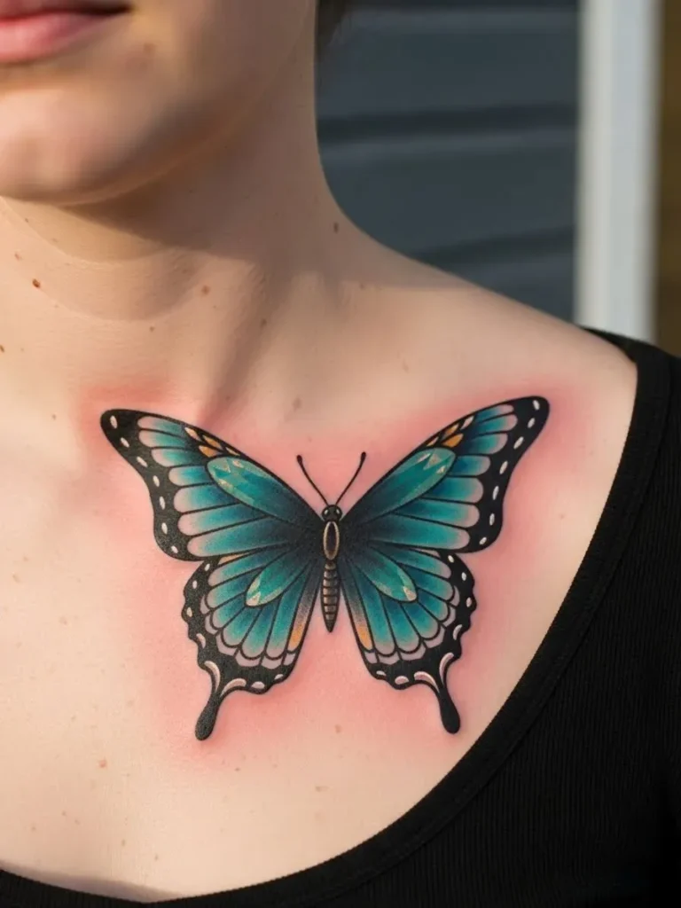 This neo traditional butterfly tattoo rests just below the collarbones with soft teal and blue tones that blend beautifully across the wings. The outer edges are lined with bold black which keeps the style crisp while the light gradients add a soft glow. The placement works so well because the butterfly spans the upper chest without feeling too large. The blush of pink around the fresh ink gives it such a pretty touch.