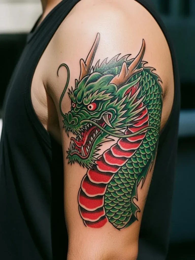 This neo traditional dragon tattoo curves around the upper arm with fiery reds and deep greens that make the scales look bold and textured. The face has sharp expressive features with bright red eyes and crisp linework that gives the dragon so much personality. The size is large and wraps the arm nicely while the color palette keeps everything lively and strong. The thick outlines and classic shading tie it all together in true neo traditional style.