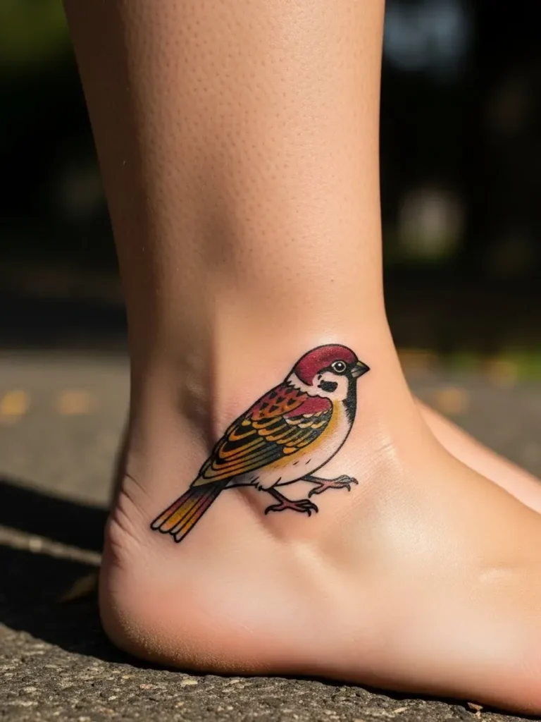 This sweet neo traditional sparrow tattoo sits on the inner ankle with soft reds warm yellows and clean bold outlines. The size is small which makes it perfect for this placement and the details on the feathers look crisp and bright. The colors blend gently while still keeping that classic flash charm. The placement hugs the ankle in a really flattering way and the tattoo feels delicate without losing its bold style.