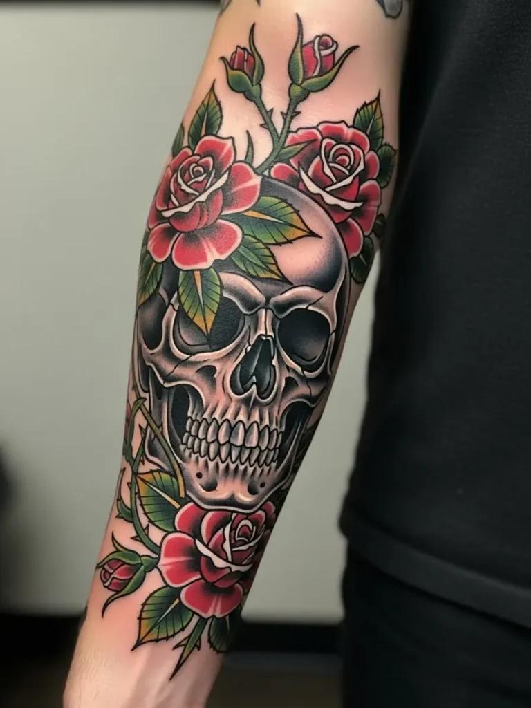 This neo traditional skull and roses tattoo covers the forearm with dramatic shading and deep bold reds. The skull sits at the center with soft gradients that give it a smooth polished look. The roses frame the skull beautifully with rich green leaves and heavy outlines that define every shape. The size is large and flows naturally down the arm which makes the whole piece feel cohesive and full of depth.