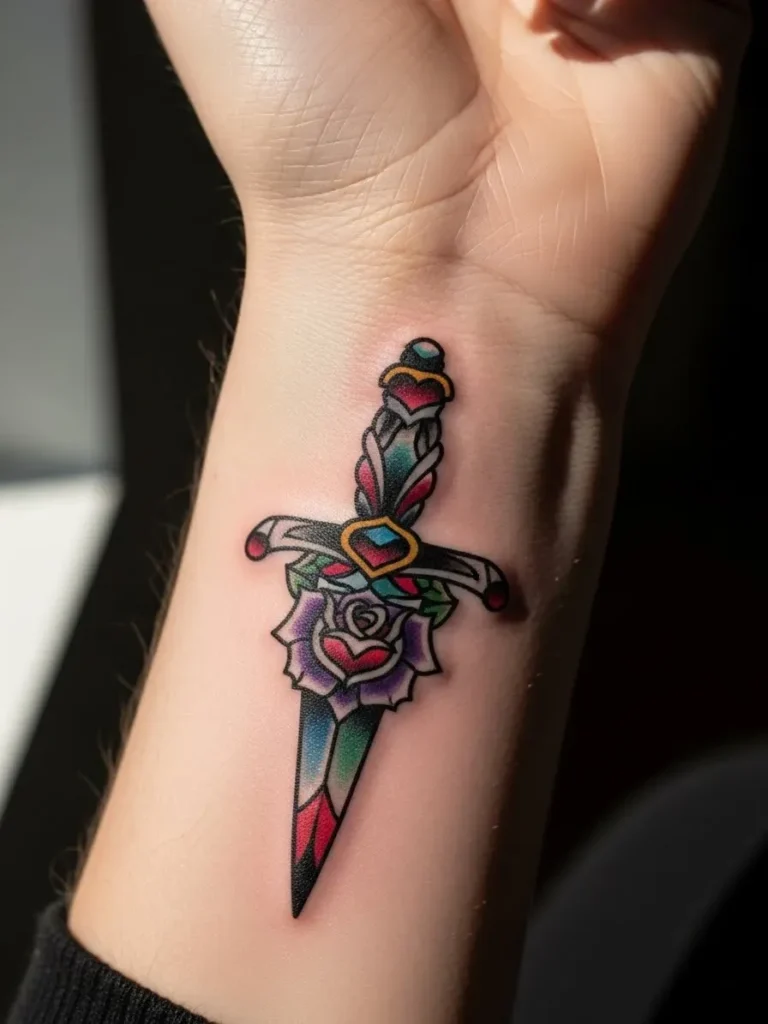 This tiny neo traditional dagger tattoo sits right on the wrist with a colorful mix of teal red purple and gold. The design includes a little rose in the center with the dagger forming a clean vertical shape. The size is small but the lines are bold which keeps the style unmistakably neo traditional. The bright colors add personality without feeling overwhelming.
