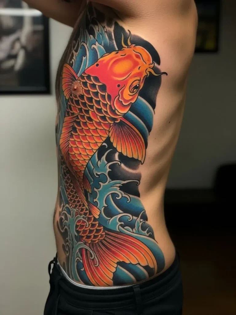 This neo traditional koi fish tattoo stretches along the ribs with bright oranges deep blacks and vivid waves of blue. The size is large and follows the side of the body beautifully. The scales are shaded with smooth gradients and the fins flow with elegant lines. The contrast between the warm koi and the cool waves makes the whole design feel lively and dynamic.