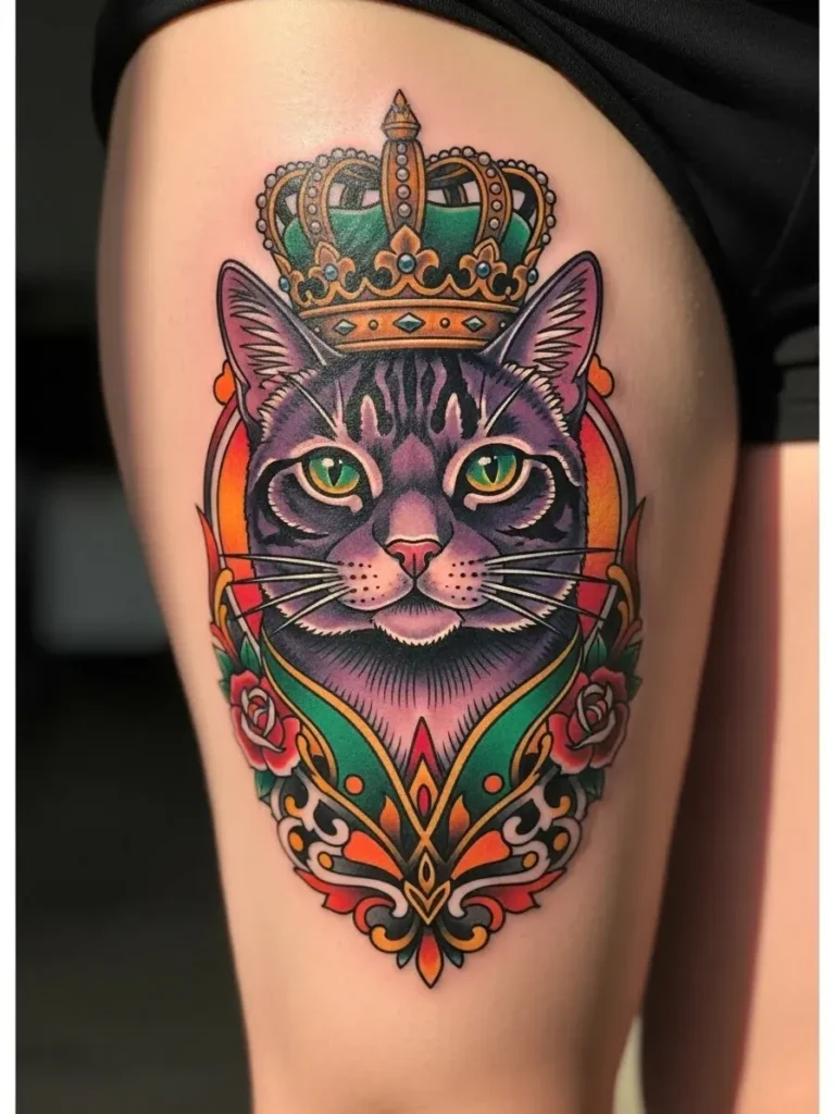 I love how charming this design is. The crown adds such a fun dramatic touch and the colors make the cat look so expressive. It is the perfect tattoo for someone who wants something bold and adorable.