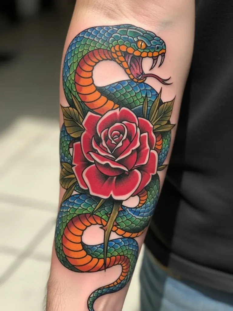 This neo traditional snake and rose tattoo wraps around the forearm with bright greens blues oranges and a deep red rose in the center. The scales are shaded with a smooth gradient that gives the snake a dimensional look. The rose sits right in the middle with bold petals that contrast beautifully with the cool tones of the snake. The size is large and fits the arm like a custom pattern.