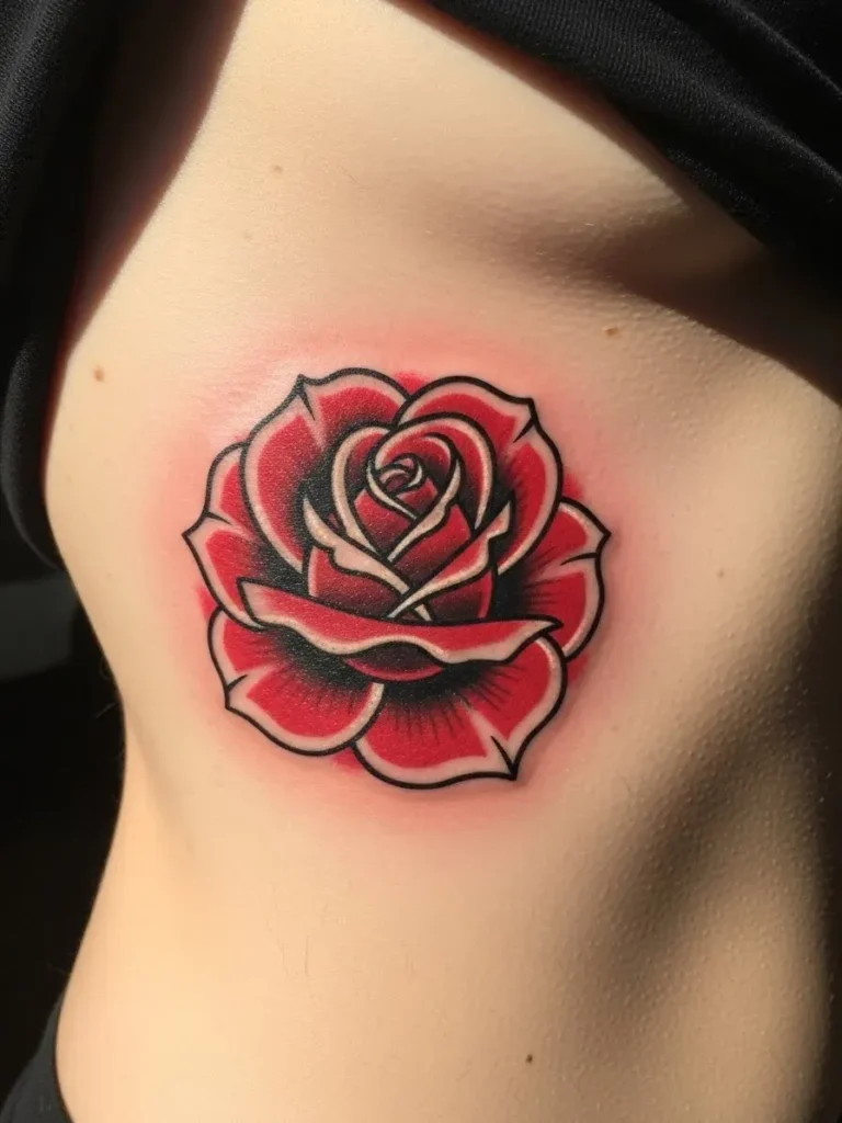 This neo traditional rose sits along the rib area with bright red petals and bold black outlines that create a soft but striking shape. The tattoo is medium sized with a lovely gradient in every petal along with a little natural redness around the fresh ink. The classic rose design feels timeless while the simple shading gives it a clean modern look.