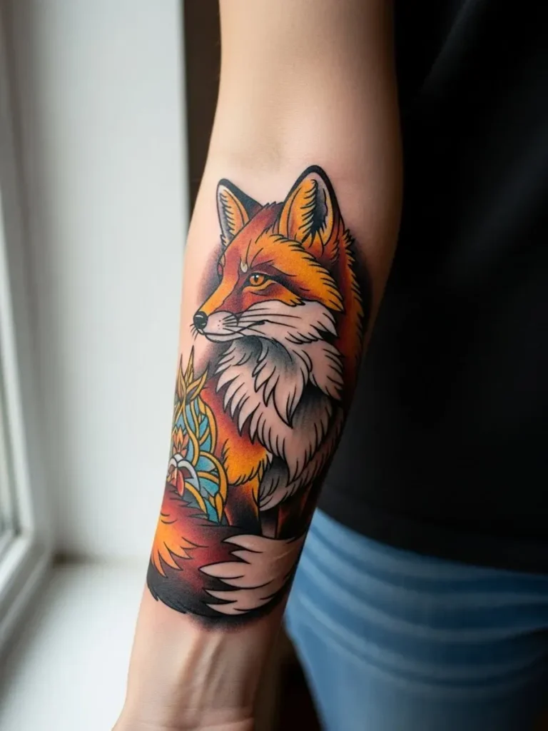 This neo traditional fox tattoo sits on the inner forearm with warm oranges soft whites and beautiful contrasting blacks. The fox looks calm and alert with clean linework and smooth shading. The floral accents near the bottom add a soft touch of blue gold and pink that ties the design together. The size fits the forearm perfectly and follows the shape of the arm in a natural way.