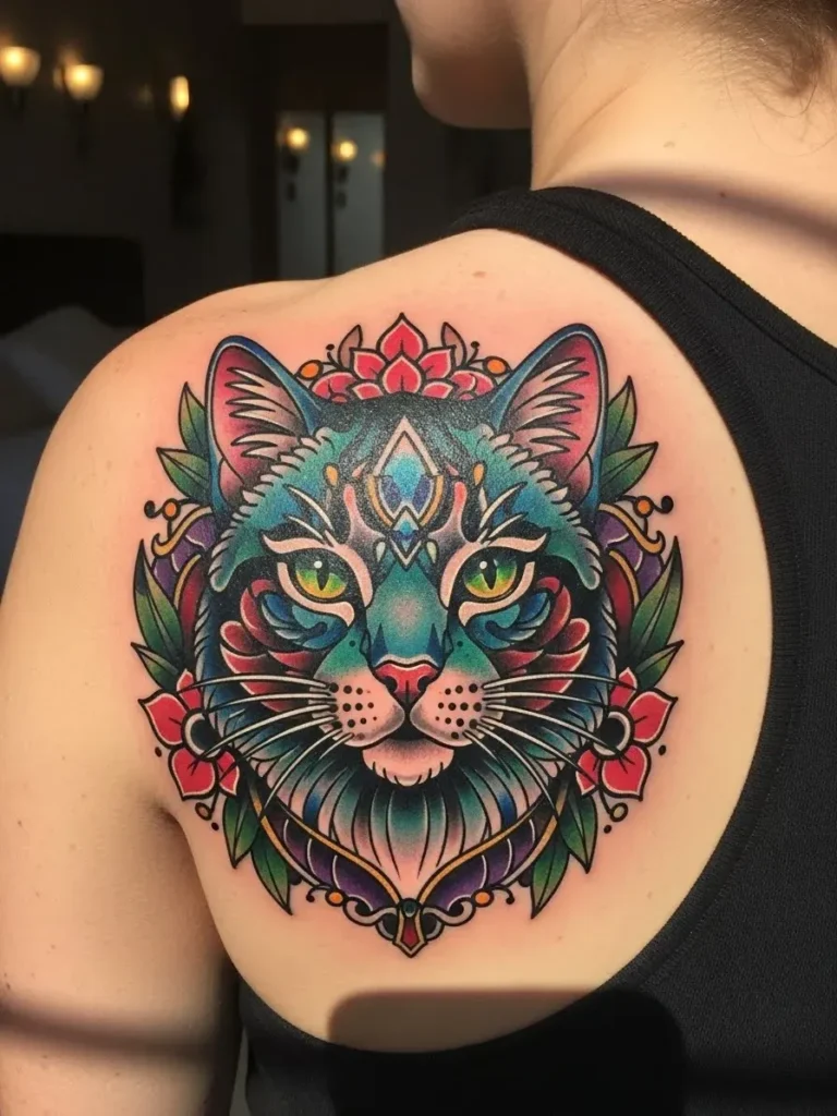 This neo traditional cat tattoo takes up the upper back shoulder area with a beautiful mix of teal blue pink and green shades. The face is framed with ornamental floral elements that give it a soft decorative feel. The size is medium to large which lets all the details shine. Every line is bold and clean which keeps it true to the neo traditional style while the color palette adds a dreamy twist.
