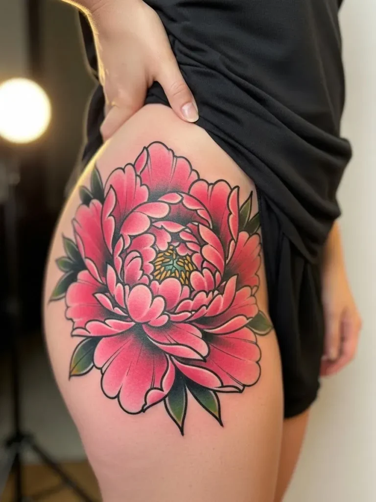 This neo traditional peony sits along the hip with big layered petals in soft reds and pinks. The tattoo is large which lets the petals open beautifully across the curve of the hip. The bold outlines keep it crisp while the shading adds a gentle softness. The green leaves add contrast and help frame the whole flower in a flattering way.