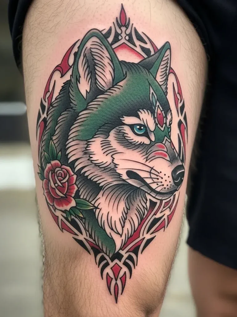 Wolf and Rose Neo Traditional Thigh Tattoo