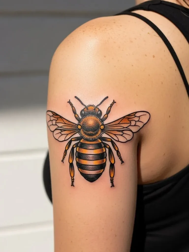 This neo traditional honey bee tattoo sits beautifully on the upper arm with warm golden tones and clean bold outlines. The wings have soft shading that gives them a delicate glow while the body shows crisp stripes that feel classic and modern at the same time. The size is medium and fits the curve of the shoulder so naturally. The color palette is simple but striking with oranges blacks and subtle highlights that make the whole design pop.