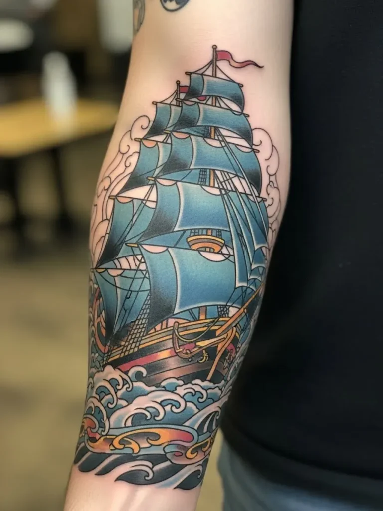 This neo traditional ship tattoo flows across the forearm with a full scene of blue sails swirling waves and classic bold lines. The size is large which lets every detail from the ropes to the water pattern stand out clearly. The blue and teal tones look so rich against the skin while the pops of warm gold in the waves add the perfect contrast. The whole design has that timeless sailor vibe with a polished modern twist.