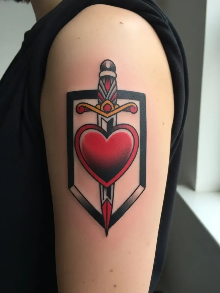 This neo traditional heart and dagger tattoo sits on the upper arm with a bold red heart framed by a clean black shield shape. The dagger passes through the center with gold accents and subtle shading that keeps everything crisp. The style is simple but strong with thick outlines and smooth gradients that make the colors glow. The size is medium and fits the arm perfectly without taking over too much space.